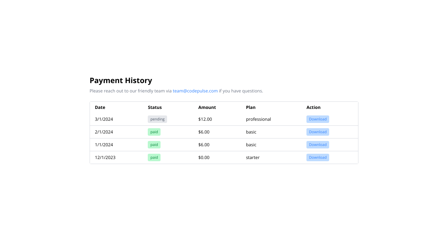 Build a responsive payment history section that allows users to view and download their past invoice details