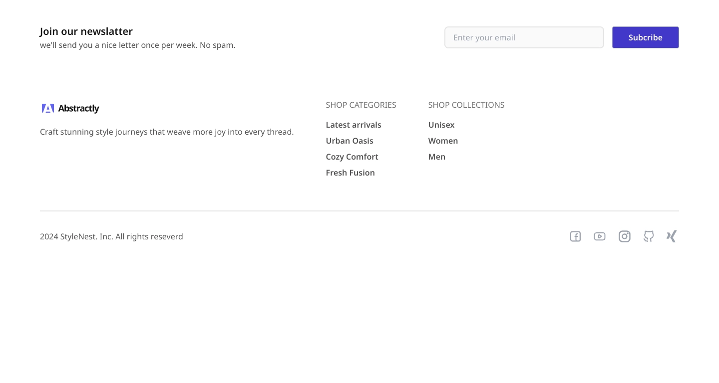 Build a multi-column footer featuring navigation links for the website, social media channels, and newsletter signup section